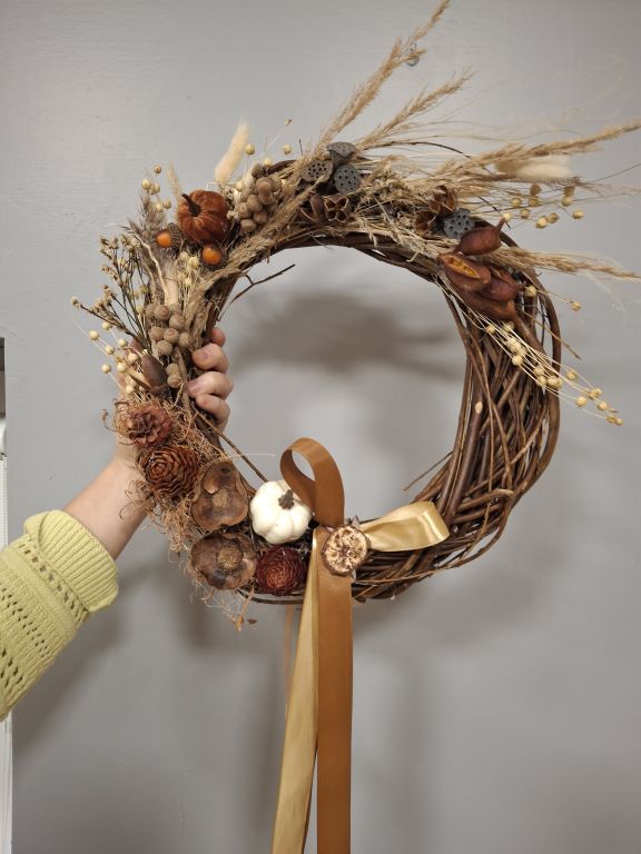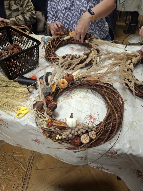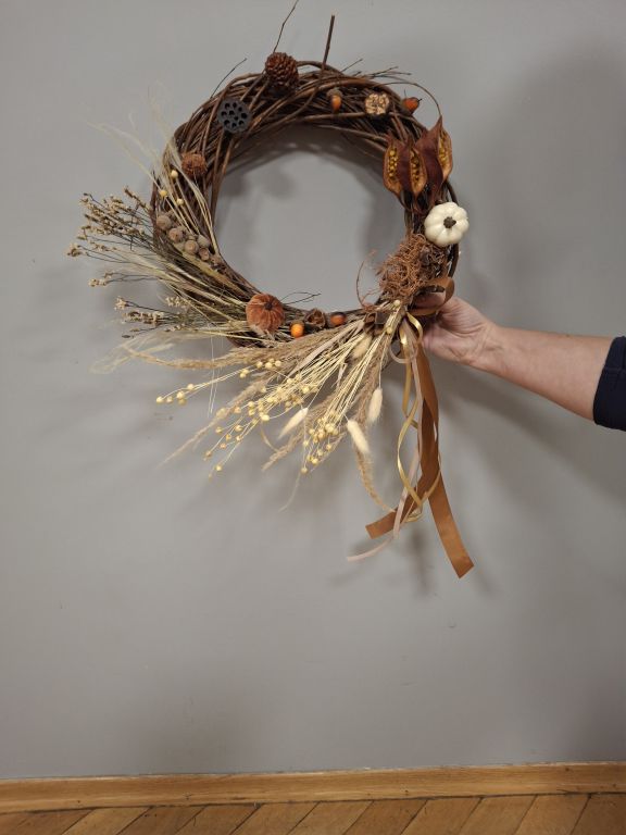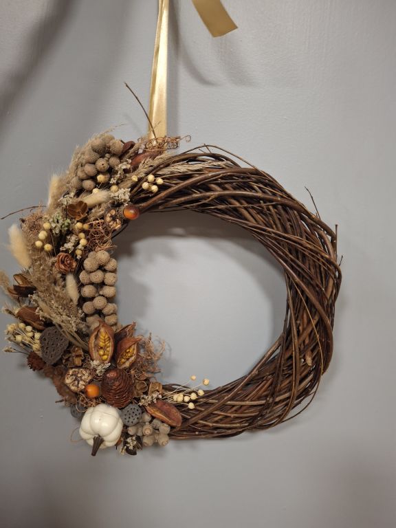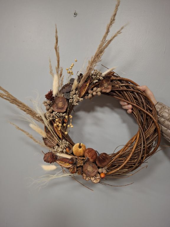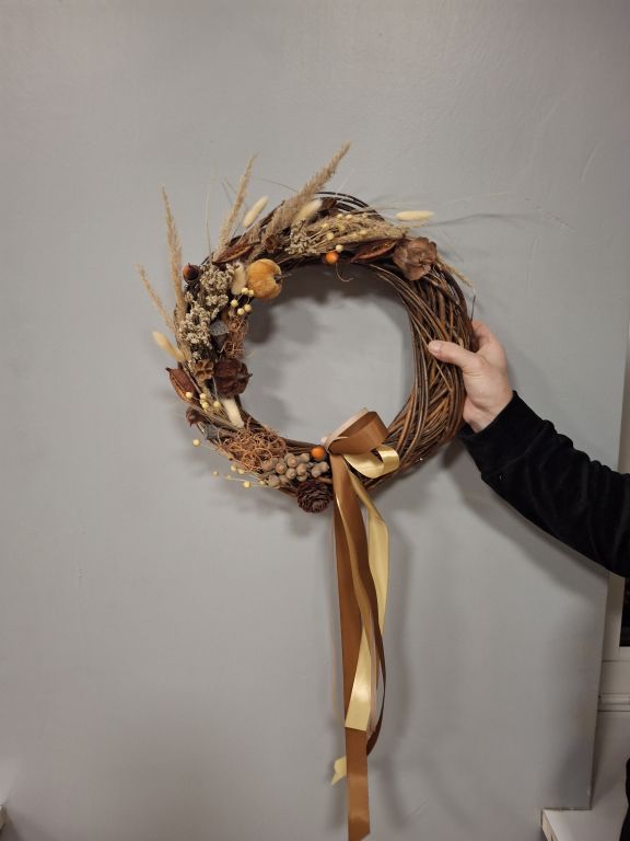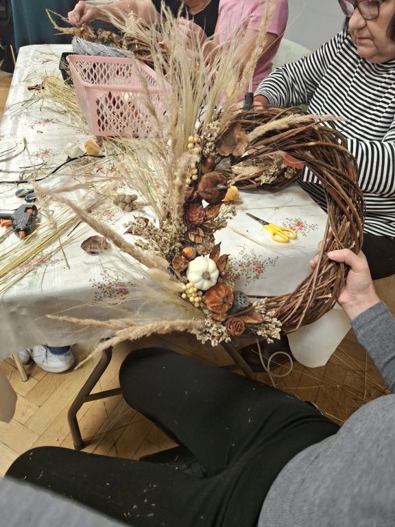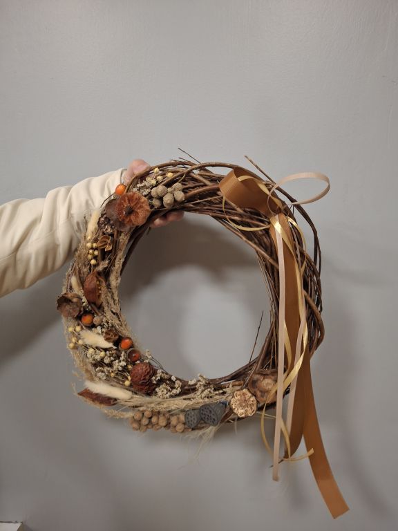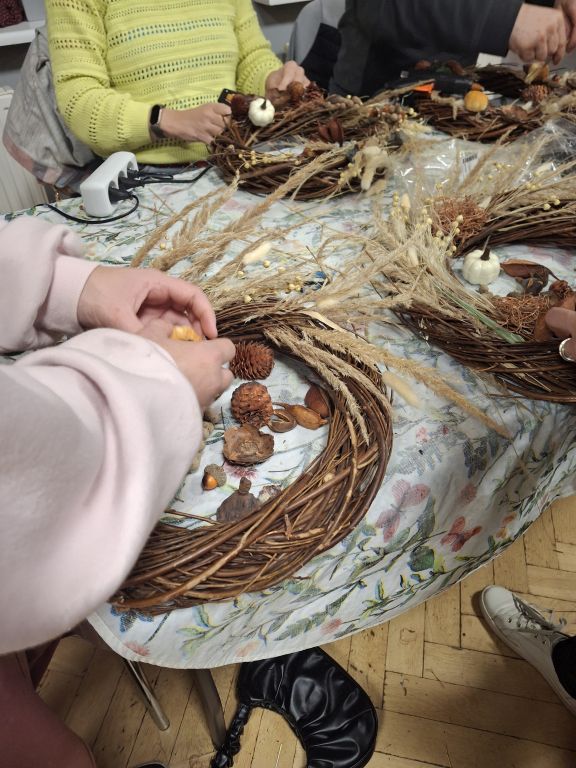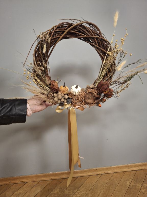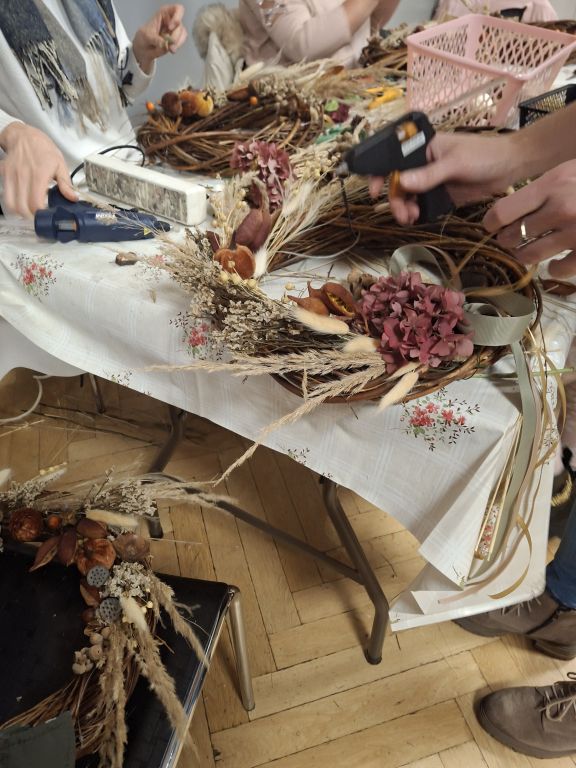 Tym razem, uczestnicy warsztatów florystycznych przygotowali jesienne wieńce stworzone na bazie wiklinowych okręgów.