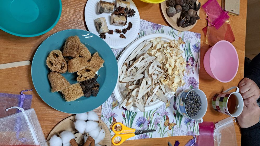 Podczas jesiennych warsztatów dla dorosłych pt. „Pachnąca szafa” uczestnicy mieli okazję stworzyć własne zapachy do szafy z wykorzystaniem jesiennych darów natury, suszu egzotycznego oraz płatków kwiatowych. Spotkanie wypełniła ciepła, twórcza atmosfera oraz aromaty, które wprowadziły wszystkich w wyjątkowy, jesienny nastrój.