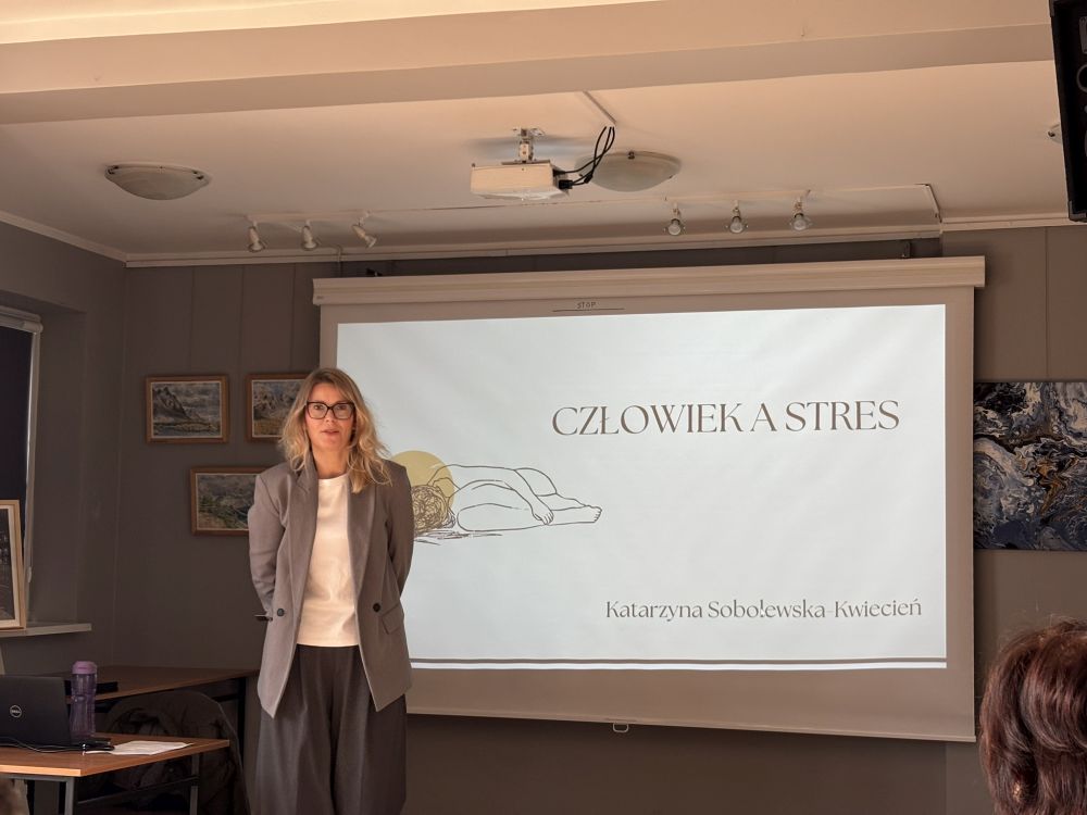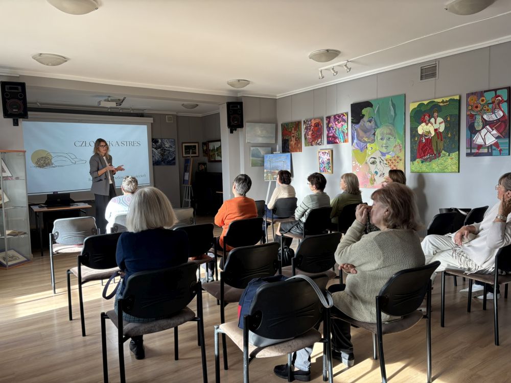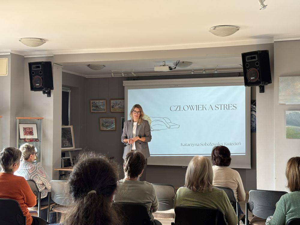 Wczoraj w MDK odbył się wyjątkowy blok zajęciowy poświęcony wpływowi stresu na nasze zdrowie oraz sposobom jego redukcji. Spotkanie rozpoczęło się prelekcją dotyczącą świadomości stresu, jego skutków oraz praktycznych metod radzenia sobie z nim na co dzień. Uczestnicy poznali zarówno fizjologiczne, jak i emocjonalne konsekwencje długotrwałego napięcia oraz narzędzia wspierające zarządzanie stresem.