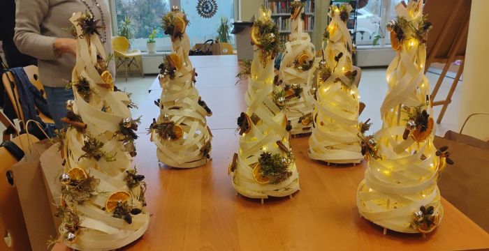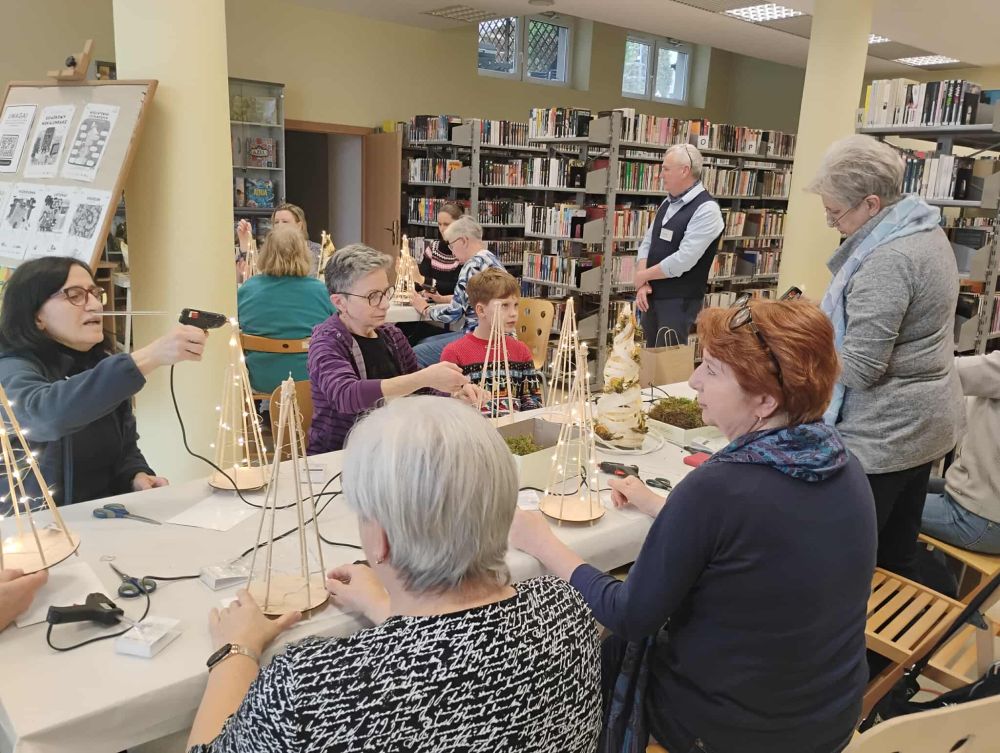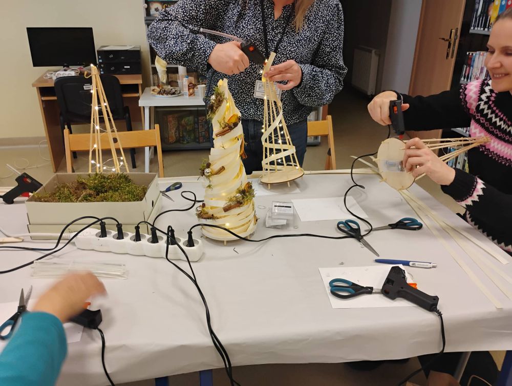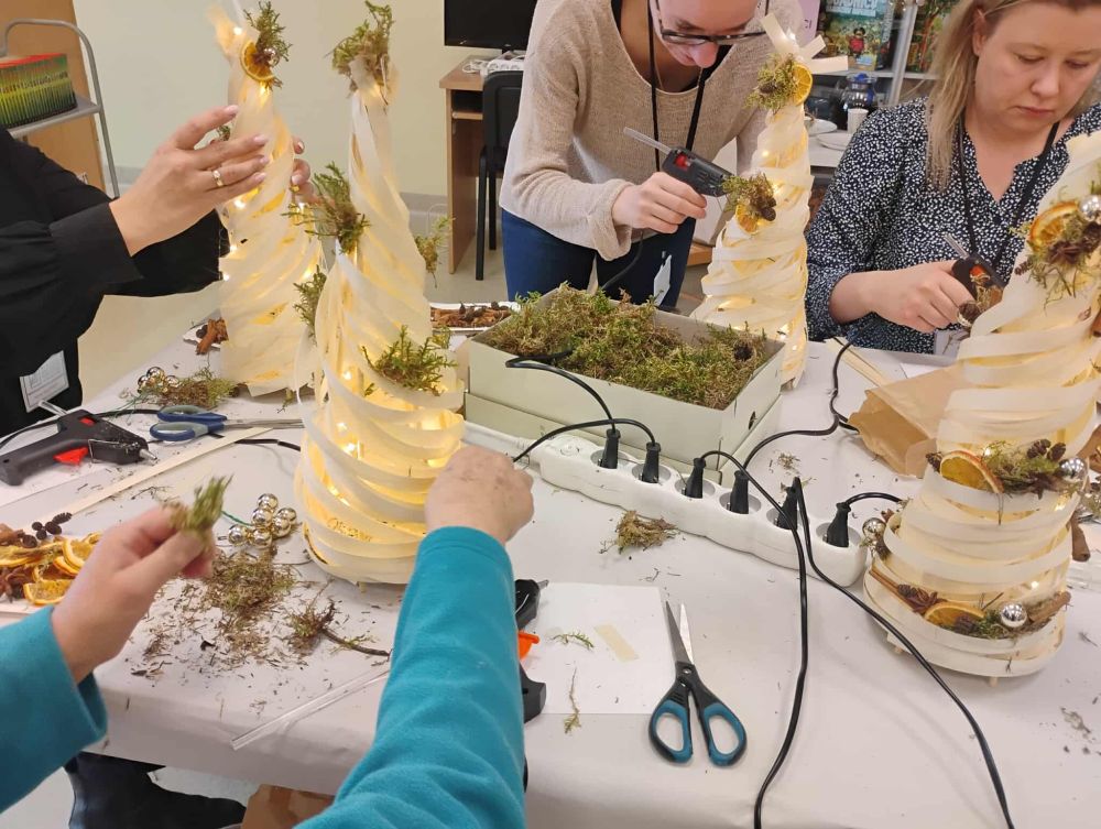 Tuż dzień przed Mikołajem miały miejsce twórcze warsztaty poświęcone wykonywaniu choinek z drewna osikowego. Spotkanie zgromadziło zarówno dzieci, jak i dorosłych, którzy wspólnie – w twórczej i pełnej życzliwości atmosferze – stworzyli świąteczne ozdoby. Uczestnicy pracowali na specjalnie przygotowanych drewnianych stelażach, oplatając je wstążkami z osikowego drewna oraz dekorując światełkami, suszonymi pomarańczami, korą, szyszkami i zimowymi dodatkami. Efekty były naprawdę imponujące! Powstały oryginalne, naturalne i bardzo nastrojowe choinki, które z pewnością będą piękną ozdobą świątecznych wnętrz.