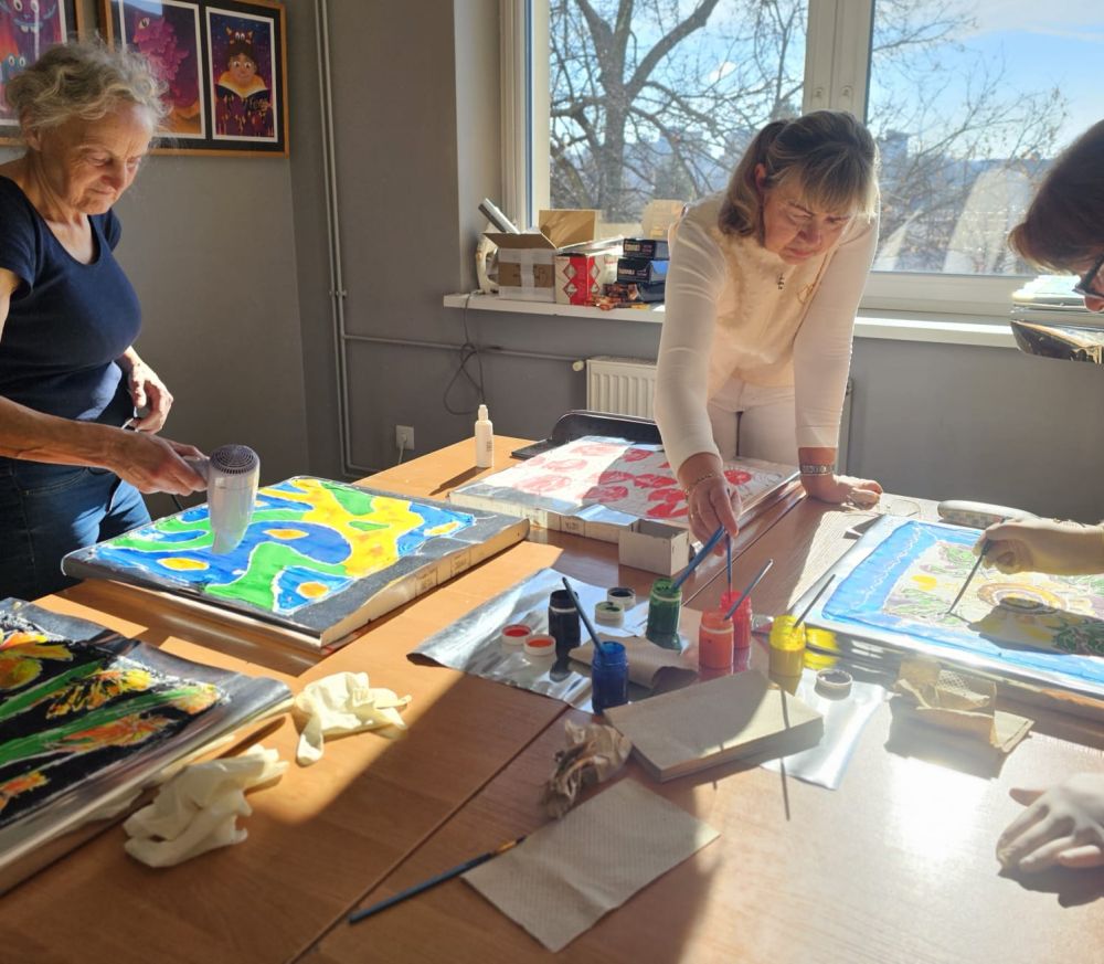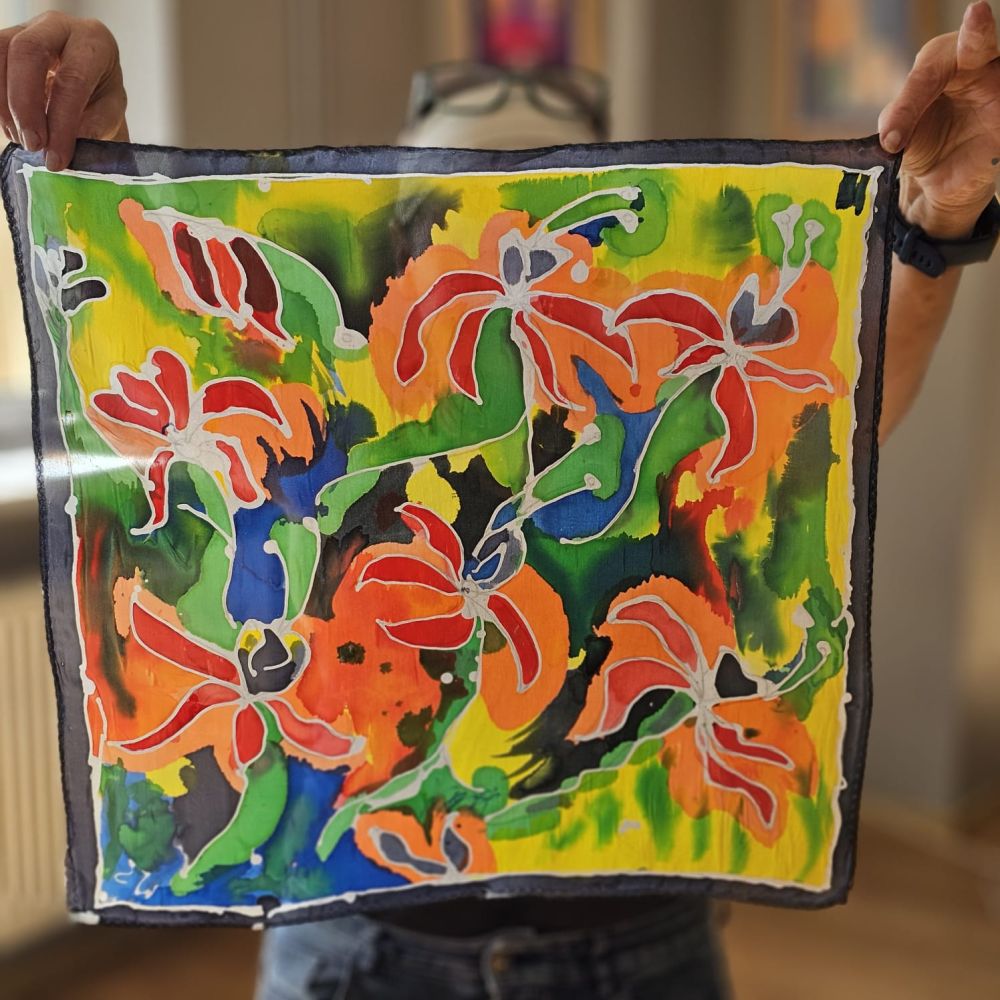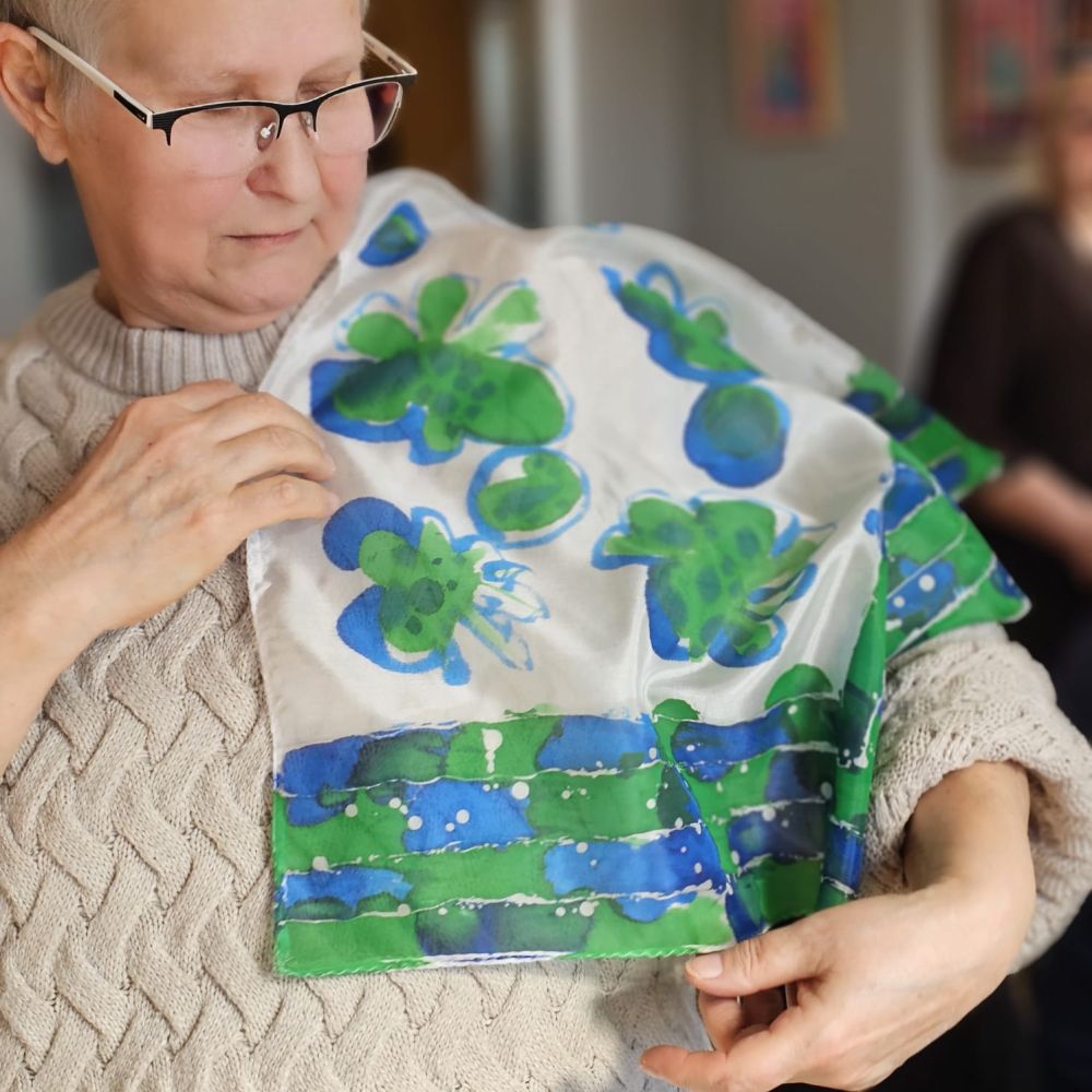 Podczas zajęć każda z Pań stworzyła swoją własną, niepowtarzalną apaszkę – pełną barw, fantazji i osobistego stylu. Jedwab zamienił się w małe dzieła sztuki, a sala wypełniła się rozmowami, śmiechem i twórczą energią.
